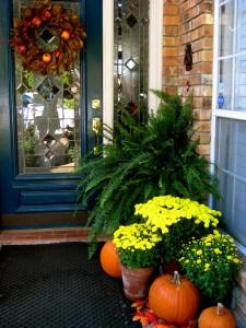 I just got back from Maine and it was definitely fall there but here in P&B Garden everything was still green and roses were still blooming. So, I had to make my own fall for Halloween this Friday so it would be festive for Jack when he visits. Jennifer was over and being playful in the faux fall color. Happy Halloween !!!
