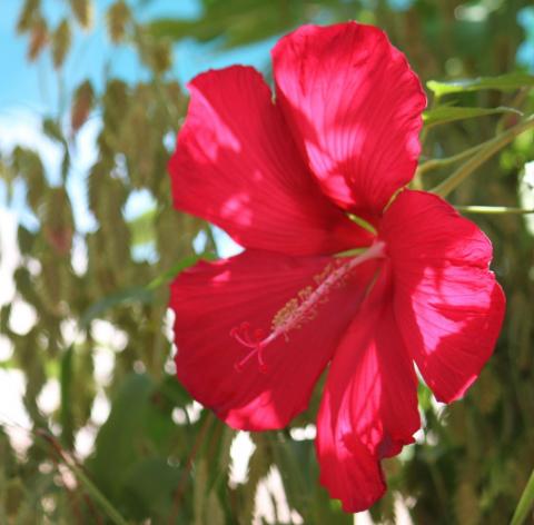 This has been a very hot summer. Tomorrow it will be September 1st and it is still in the 90's. Our Lord Baltimore Hibiscus was beautiful this year. It bloomed over and over again with huge blooms of red color making our yard a tropical paradise. It was fun to float around in the pool, the few times that we stopped to do so, and watch the large blooms look down at us.