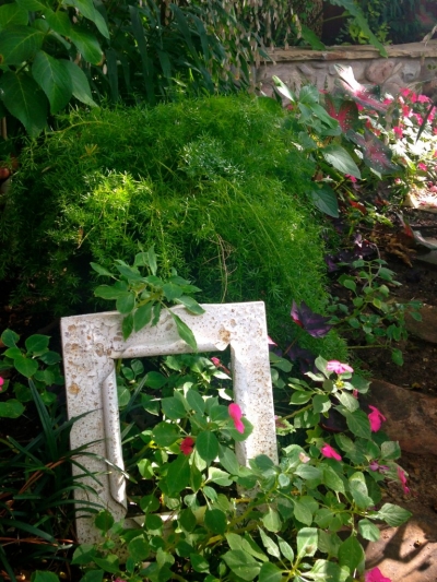 I had this old frame that was so pretty I did not want to throw it away, so I created a live picture of one of the most beautiful shade gardens we have ever grown. The picture frame is full of inpatiens and surrounded by hydrangea, sea oats, asparagus ferns and caladiums.