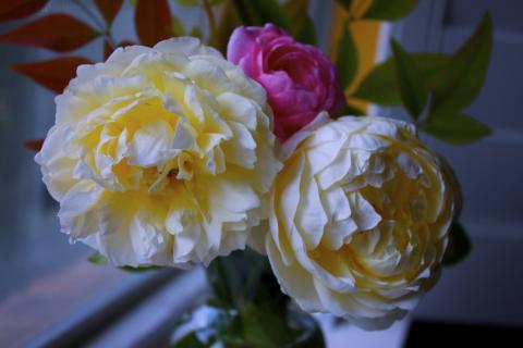 When we started building our garden, we chose Knock Out Roses, the easiest rose to grow here in North Texas. Three years ago, I discovered the David Austin Rose. They are a lovely, fragrant English Rose. I have found them also easy to grow in North Texas.There are over 800 roses in the David Austin collection and I will find a place for as many varieties as I possibly can in P&B's Garden ! Below are Darcey Bussell (top) named after the highly acclaimed English ballerina and Charlotte (bottom) with Belinda's Dream, picked today and shown in a vase.