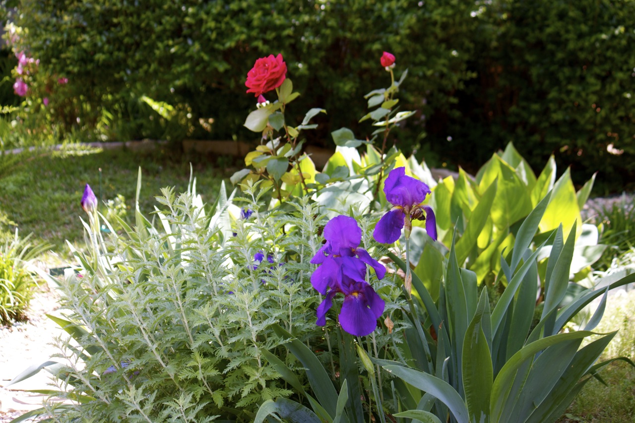 This beautiful grouping of roses and irises greeted me when I turned into the driveway tonight. What a beautiful spring day and so good to be home.