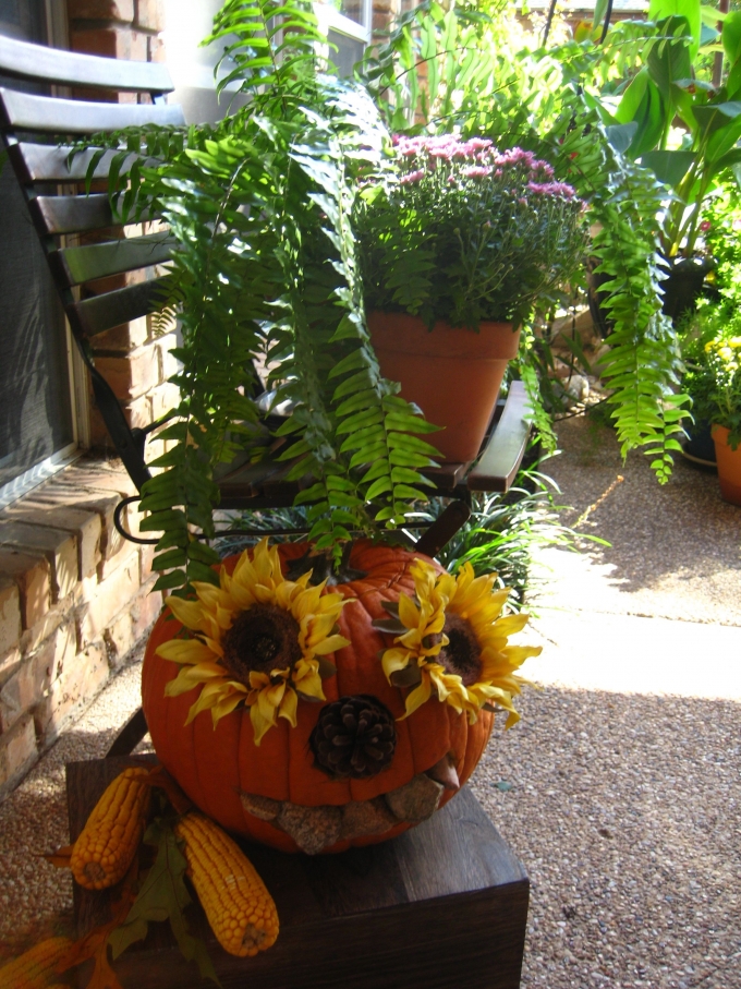 I am married to a very creative man. Saturday night we were invited to a Halloween party that was holding a pumpkin carving contest. Paul brought the pumpkin home at 5PM that evening and we needed to leave by 6PM. I said, "EeeeeeK" and he said "Nooo Problem". With a knife in hand, he went off to the side of the house to create this masterpiece which won the contest !! This man has definitely missed his calling.